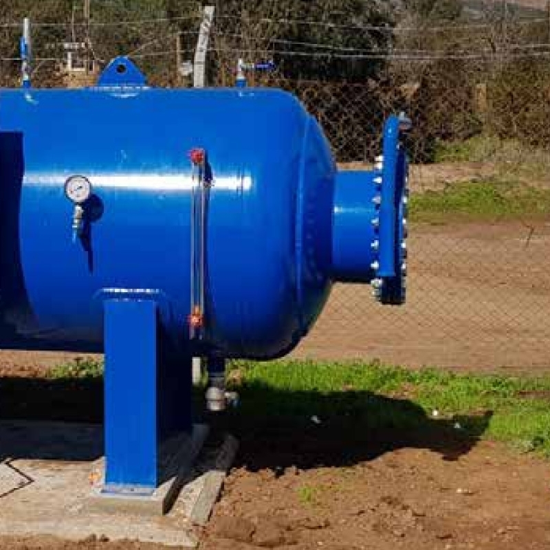 Suministro de 1 estanque horizontal de 2700 litros PN10con un medio de amortiguación del golpe de ariete operado por compresor.